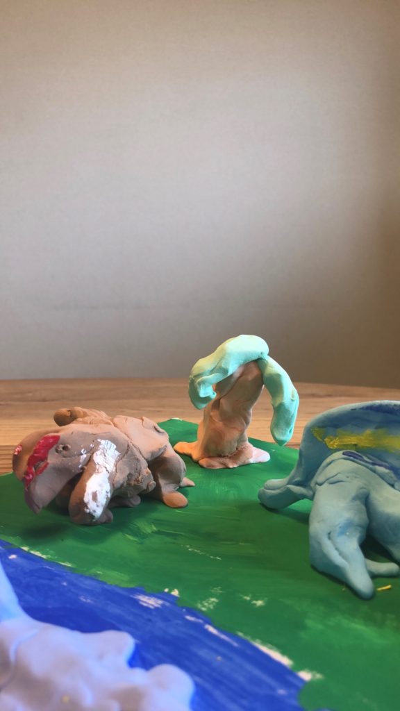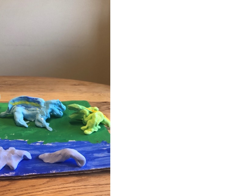 頑張ってますね。いろいろなカラー粘土があるので色の研究をしながらカラー粘土を作ってくれたのがよくわかります。 粘土が余ったら 袋に入れたり、サランラップで包んで保管してください。粘土で草や木をたくさん作ってあげるともっとよくなると思います。