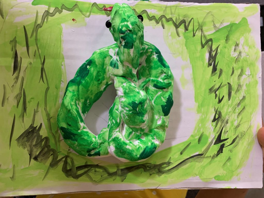 蛇がとぐろをまいている様子をとても上手に作ってあるね!緑も一色ではなくて、周りの草と体と模様と、別の色を使っているのも工夫をされていて良いですね♪