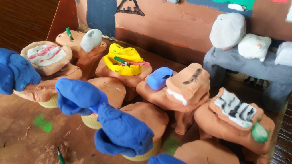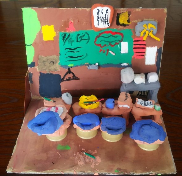 kugayama 2020年6月23日 9:37 PM 教科書やふでばこ、防災頭巾まで!細かいところまで作られていていますね◎ 鉛筆が下に落ちているところ、よく学校の教室で見られる風景ですね〜 チョークいれもあって、よく観察できているなぁと感激です◎そこ、粉だらけになるよね〜 右上のはスピーカーかな?いまにも学内放送が聞こえてきそうです! あすな先生より 返信