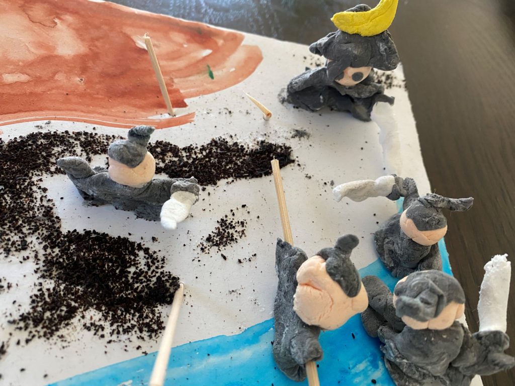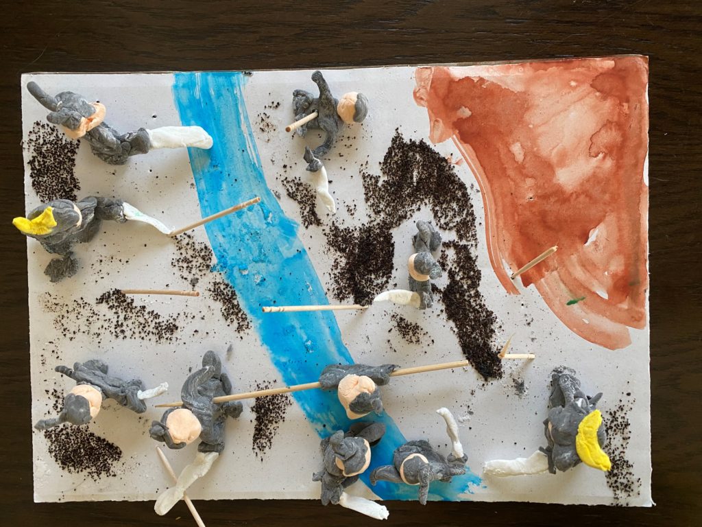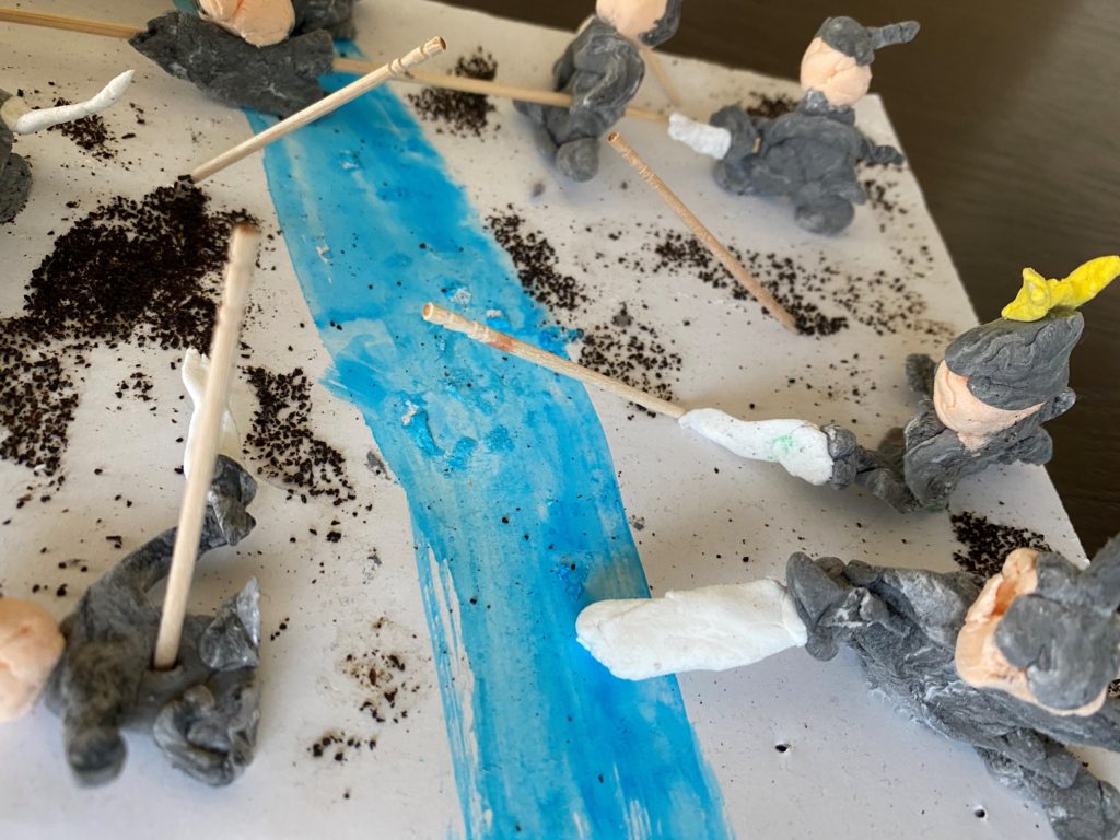 竹ひごで槍、コーヒーの粉で川原の地面を現し、