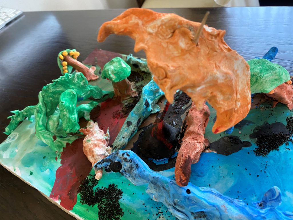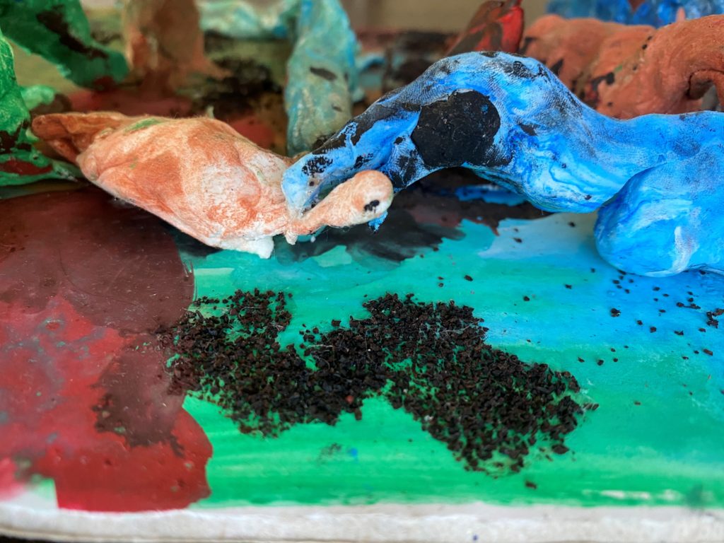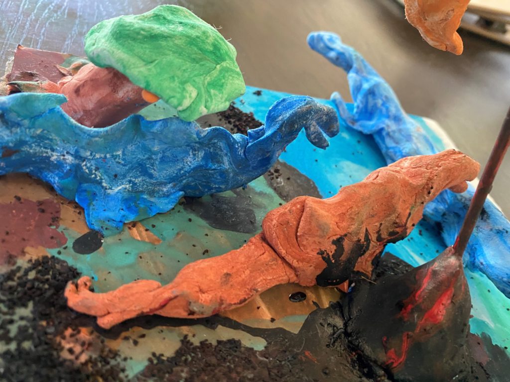地面の色選びが素敵だと思いました。少しづつ色を変えた鮮やかな色味が恐竜をよく引き立てていると思います!