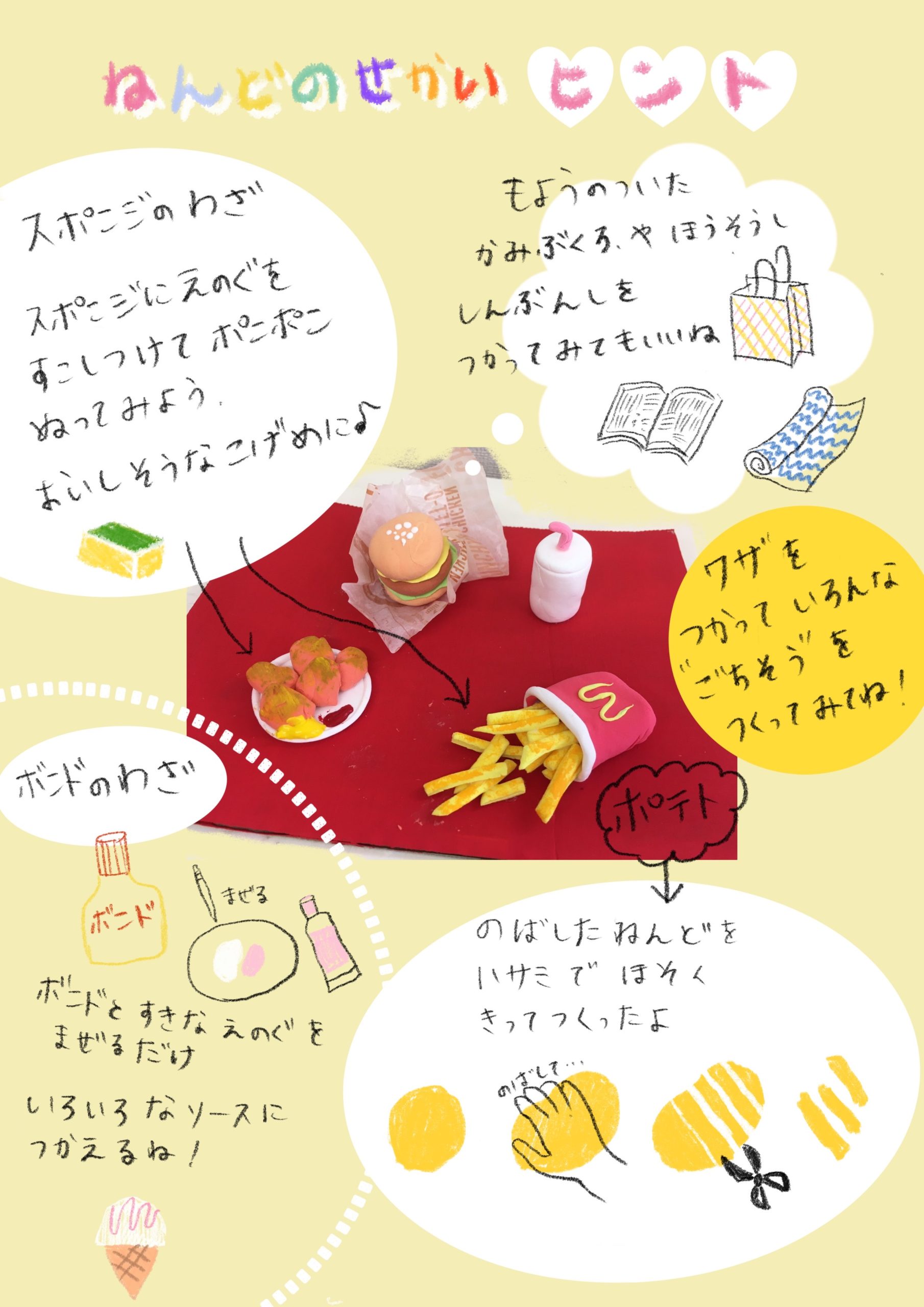 ねんどの世界へようこそ! 動画制作:あすな先生 【わざのしょうかい じかん】4:00 カラーねんどのつくりかた5:10 はさみのわざ7:40 へびのわざ9:10 スプーンのわざ10:20 つまようじのわざ11:20 ボンドのわざ12:10 つまようじのわざ214:45 じょうぎのわざ15:35 スポンジのわざ16:55 はぶらしのわざ17:25 コーヒーのでがらしのわざ18:35 トイレットペーパーのしんのわざ18:50 カッターのわざ19:45 「どだい」のつくりかた21:35 リアルな野菜 ヒント作成:たかだりさ先生